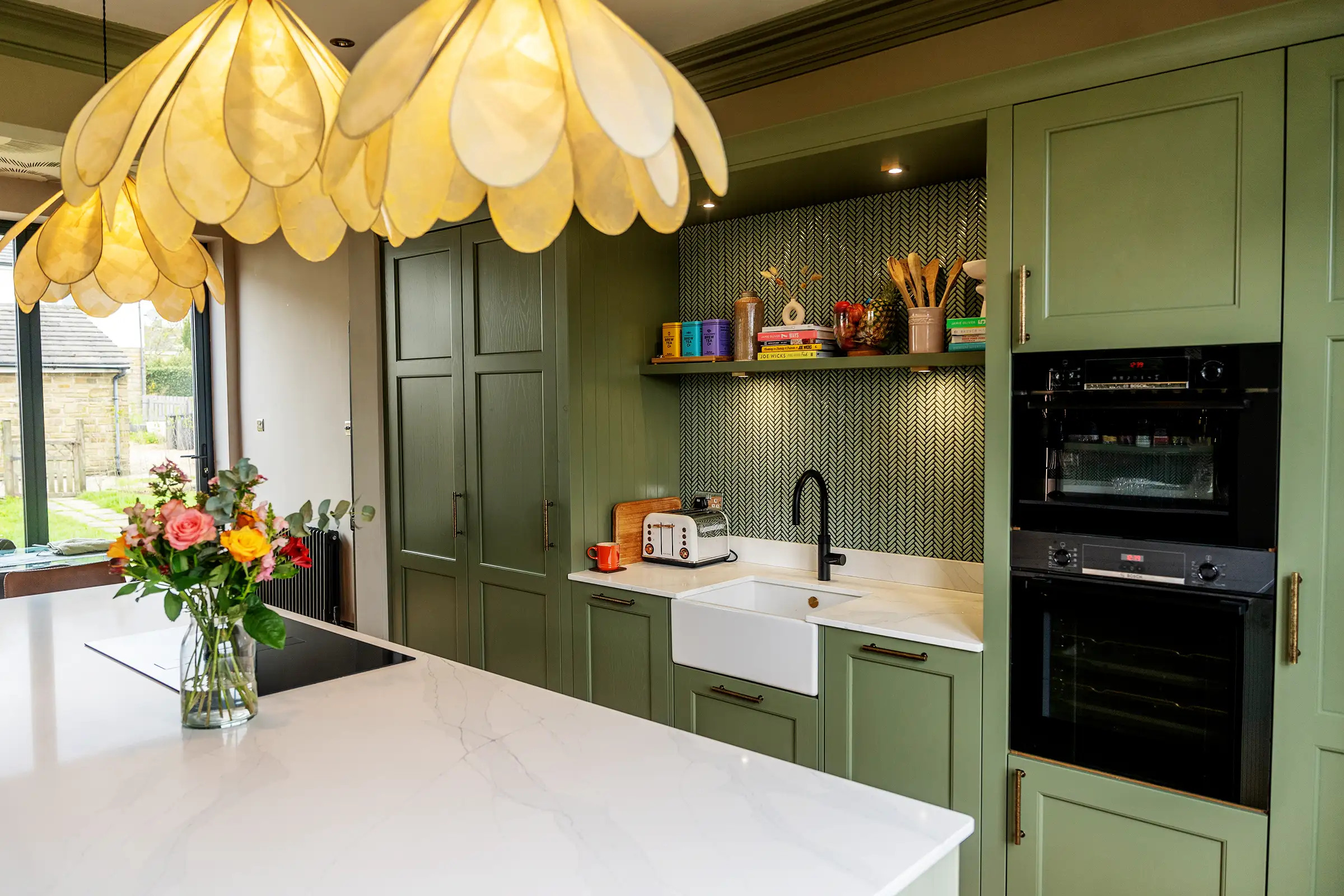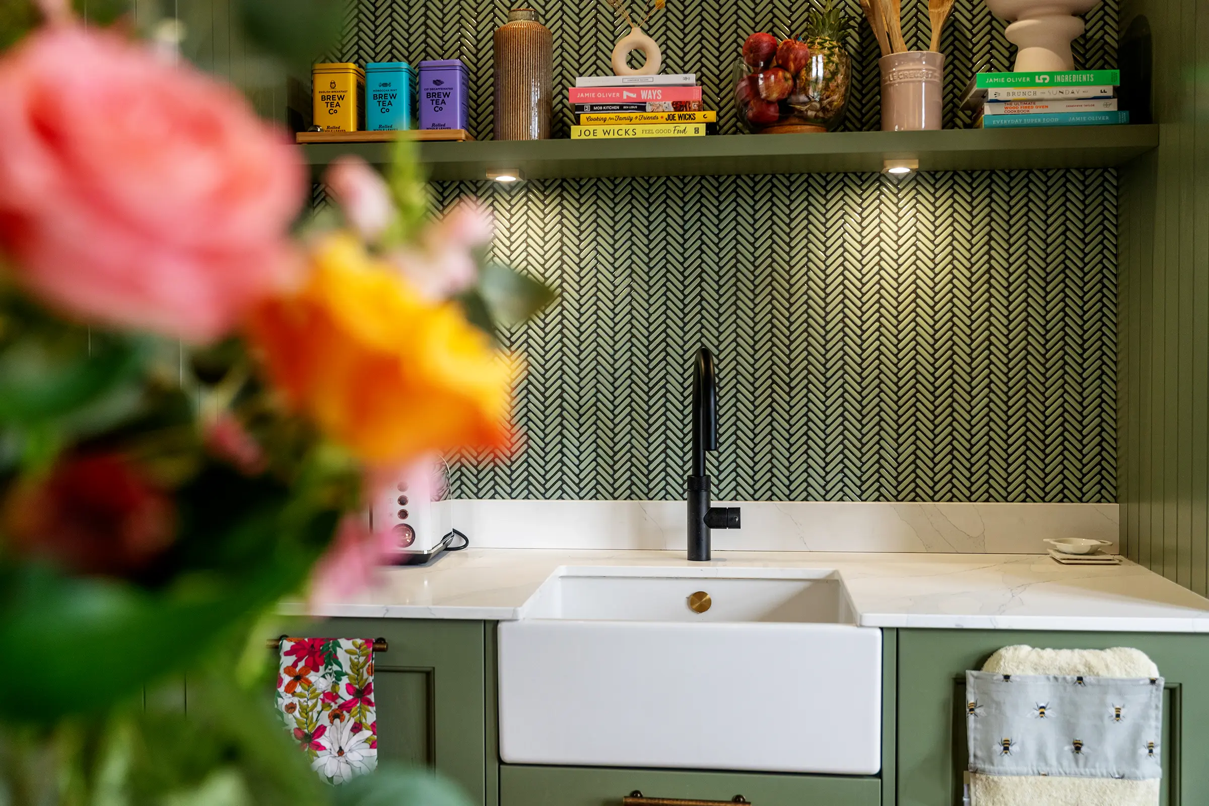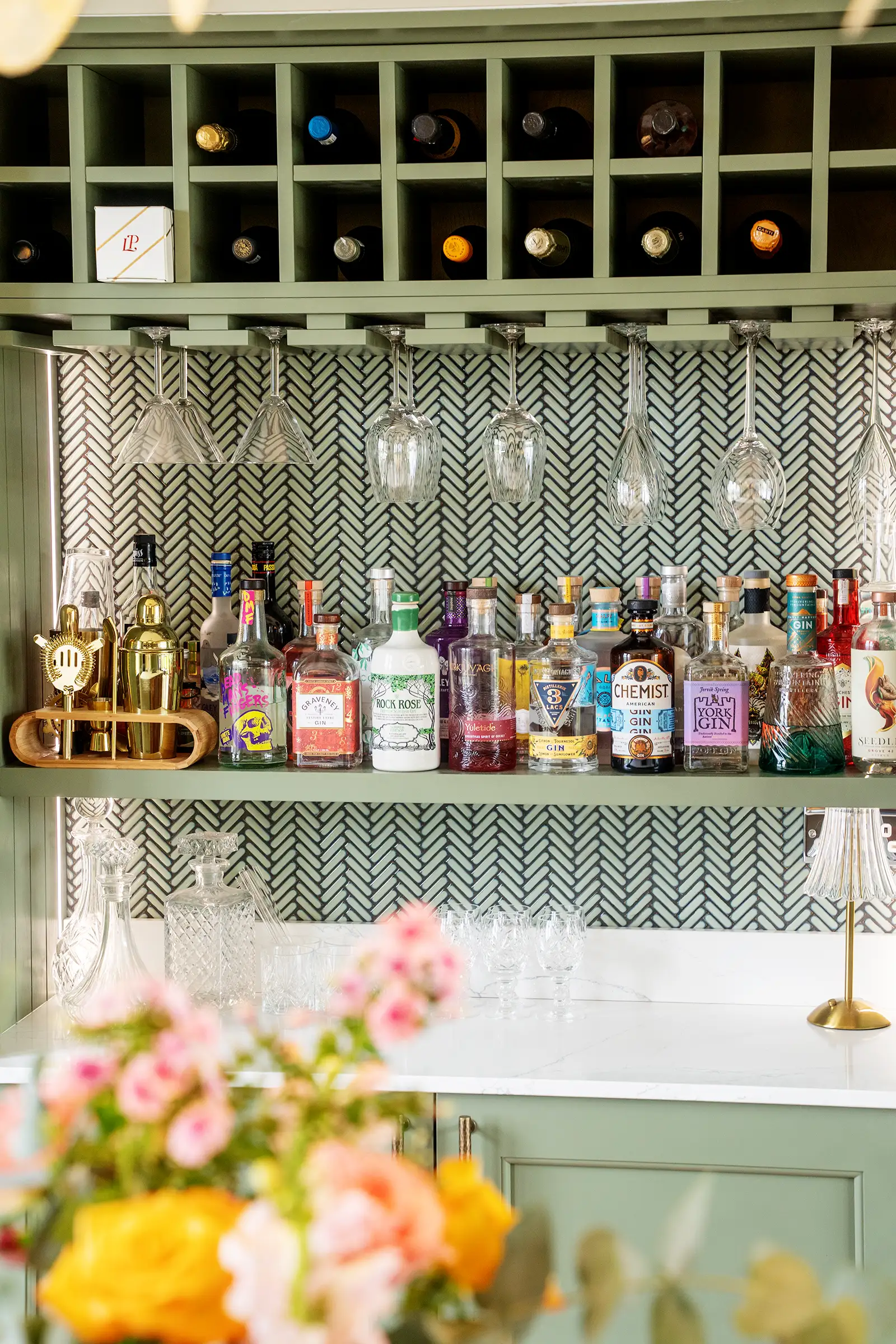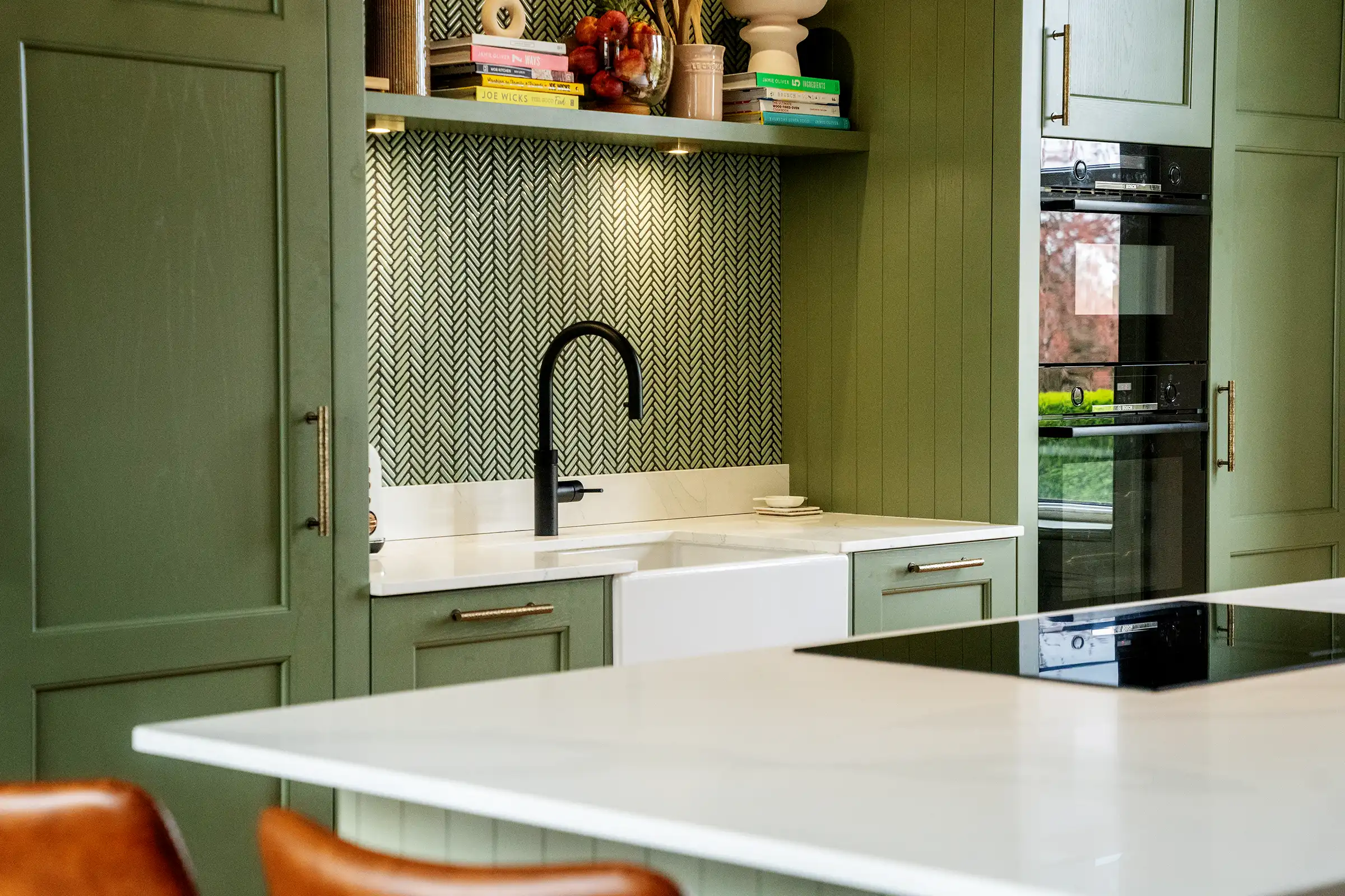 The hardware is equally considered, with matte black handles providing a tactile, high-contrast detail against the soft Sage Green painted surfaces. At the heart of the layout is the bespoke integrated gin bar feature, a dedicated architectural hub designed to break up the cabinetry and provide a social focal point. Every detail, from the multi-tonal herringbone splashback to the precision-fit Belfast sink, has been engineered by Gareth to ensure the space is as practical for the modern chef as it is beautiful for the homeowner.