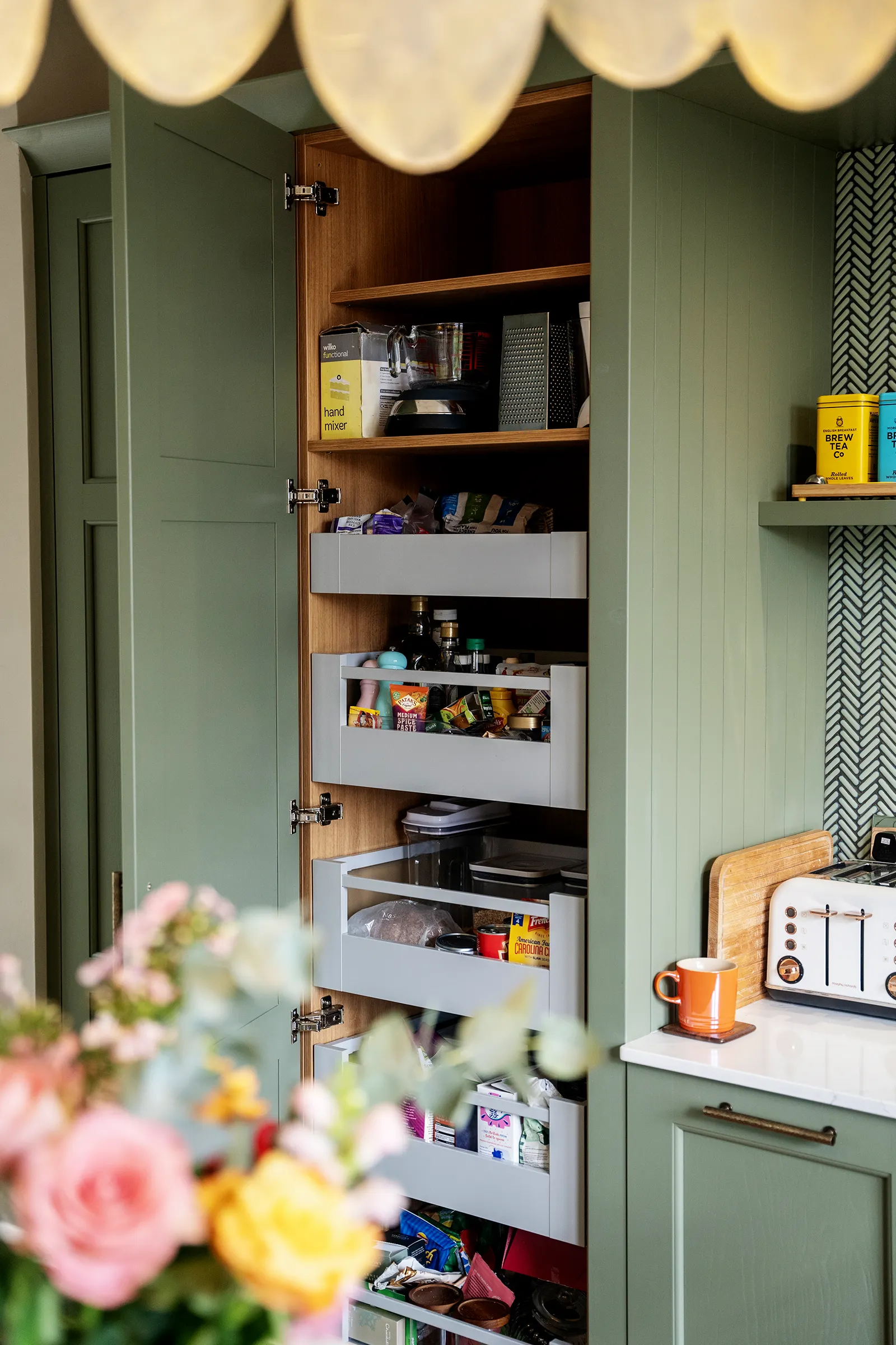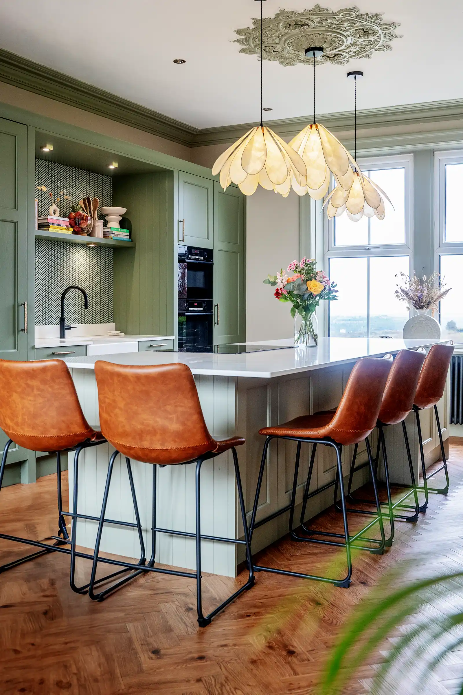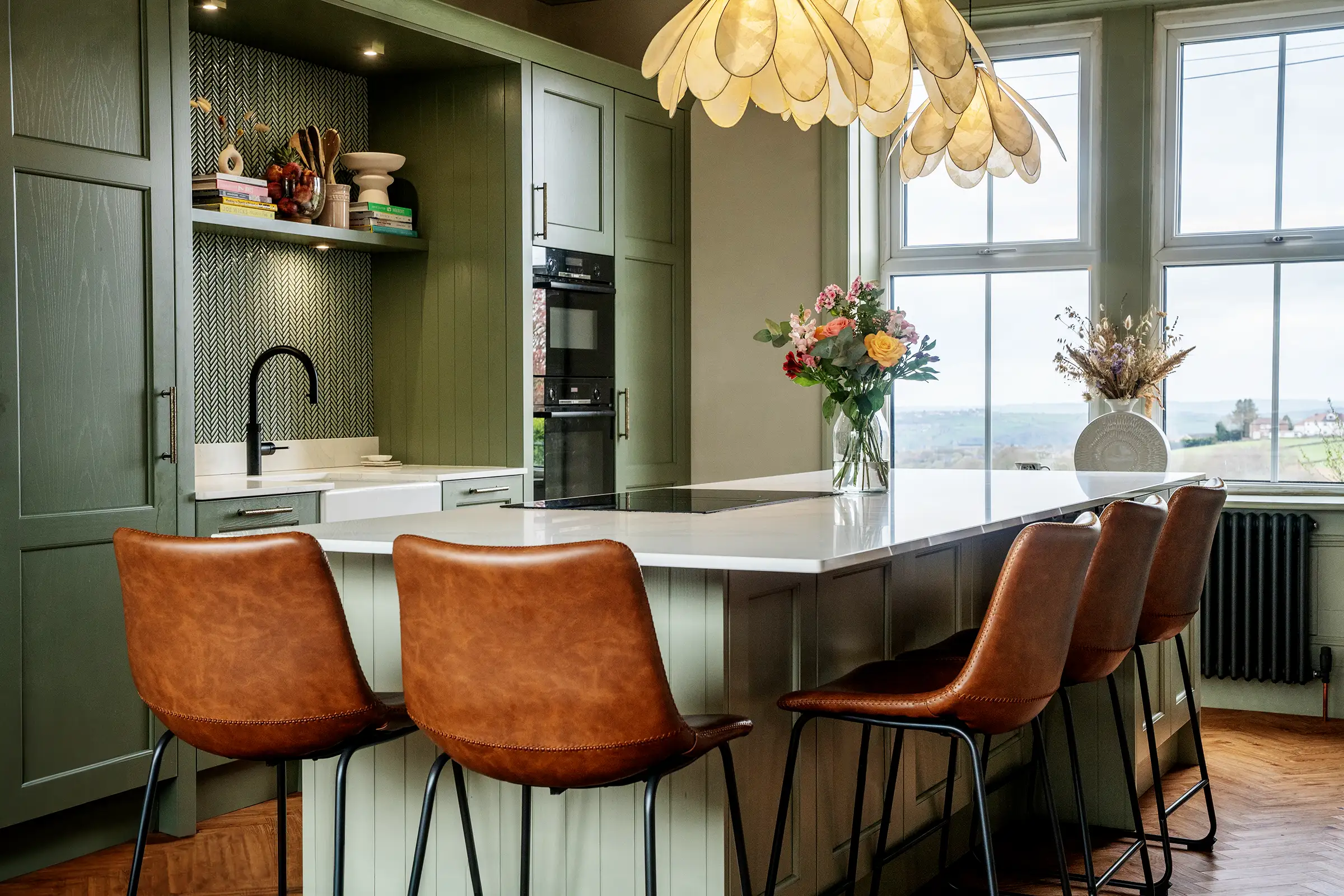Designing the Brampton was about capturing the rugged soul of the Yorkshire hills and refining it for a sophisticated Harrogate home. It’s a balance of tactile materials—where the soft sage tones meet the industrial weight of the hardware. The bespoke tongue and groove panelling adds that handcrafted heritage feel, while the integrated gin bar ensures the space remains the ultimate social hub. It’s a sanctuary that feels both deeply established and completely effortless.